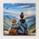 Recuperador de oro y joven chica mirando el amanecer sobre una escena de montaña.
