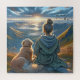 Recuperador de oro y chica joven mirando el amanecer sobre una escena de montaña con pájaros volando.