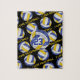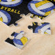 Este rompecabezas para chicas de patrón de voleibol presenta un arte azul, dorado y blanco más grande, de voleibol estilizado, sobre el cual su nombre y número de camiseta pueden ser personalizados, sobreponiendo un patrón de bolas de voleibol azules, doradas y blancas más pequeñas en un fondo negro y un texto de tipo carta-carta "Me encanta el voleibol" en oro que se extiende entre las filas de voleibol anglaseadas - por katz_d insignificancia