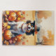 Una pintura acuarela de un perro alegre sentado en medio de un montón de hojas caídas vibrantes, rodeado de pequeñas calabazas y bellotas dispersas. El perro lleva un pequeño gorra peregrino y vigas de alegría, capturando el espíritu del Día de Acción de Gracias. Como telón de fondo, los campos de suave cosecha y los árboles de tonos dorados crean un ambiente campestre tranquilo. Las texturas suaves y los tonos cálidos y mudos del otoño le dan al lugar un ambiente acogedor y nostálgico, perfecto para celebrar la belleza de la temporada.
