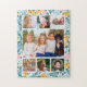 Rompecabezas de bonito de fotos florales con espacio para siete fotos dentro de un marco de flores en rosa, amarillo y azul.