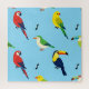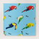 Let the vibrant energy of the rainforest fill your world with this joyful, playful seamless pattern! Bright macaws in fiery red and blue, cheerful yellow canaries, elegant green parakeets, striking toucans with bold multicolored beaks, and tiny songbirds perch and flutter across a fresh sky-blue background. Scattered musical notes add a whimsical, melodic touch to the lively cartoon style and saturated tropical palette—perfect for bird lovers, jungle enthusiasts, and anyone craving cheerful, exotic, feel-good vibes.