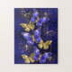 Composición de lujosas mariposas de zafiro y joyas de oro sobre fondo azul texturado.