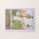 Adorable rompecabezas de conejo para amante del jardín. Diversión para cualquier edad. El rompecabezas cuenta con un conejito de peluquería de lujo en el jardín con pajarera y mariposa. Jardín ilustrado con conejito de judithchengart