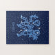 Rompecabezas con el símbolo zodiaco de Gemini en azul plateado suave, cubierto con las estrellas de la constelación, contra un fondo estrellado del cielo clasificado de azul oscuro a negro.