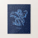 Rompecabezas con el símbolo zodiaco de Virgo en azul plateado suave, cubierto con las estrellas de la constelación, contra un fondo estrellado del cielo clasificado de azul a negro a medianoche.