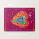 Esta manta de lana enganchada presenta un corazón retro de estilo hippie con un fondo rosado, rosa y turquesa. Personaliza con los nombres de la pareja y la fecha en escritura moderna. Diseñado por el artista de renombre mundial Tim Coffey.