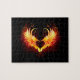 Ángel dispara el corazón con las alas flameantes sobre fondo negro.