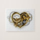 Corazón mecánico, volumétrico, de vapor punk con manómetro de presión, acero y engranajes dorados sobre fondo blanco. Estilo Steampunk.