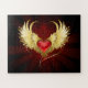 Corazón rojo brillante de un ángel con alas doradas brillando en el fondo rojo oscuro y radiante decorado con un patrón.