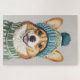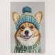 Un ilustracion reconfortante con un alegre corgi vestido con un acogedor suéter de punto y una abeja azul y verde a juego con un pom-pom. Los ojos brillantes y la expresión alegre de las crías hacen de esta imagen perfecta para las vibraciones de invierno y los amantes de las mascotas.