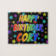 Este animado y divertido diseño de rompecabezas con temática de cumpleaños incluye el mensaje "FELIZ CUMPLEAÑOS, CORY" con los personajes que tienen un coloreado patrón de gradiente inspirado en el espectro del arco iris, además de un vibrante patrón de fondo de estrellas. Un rompecabezas vibrante como este podría ser una manera divertida de enviar saludos de cumpleaños a alguien llamado Cory. [~Z0000468]