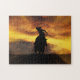 Silhoueteado por el cielo del suroeste, este vaquero super fresco en su caballo persiguiendo a un toro mientras el sol cae. Un divertido rompecabezas occidental de campo.