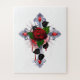 Cruz de plata con rosa roja y hojas negras sobre fondo blanco.