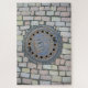"Praga Manhole Cover, Prague Castle Complex, Praga, República Checa" por Catherine Sherman. Una tapa de alcachofa con un diseño y texto intrincados está incrustada en una calle adoquinada en el Complejo Castillo de Praga, Praga, República Checa. La cubierta de desagüe presenta los motivos arquitectónicos del Escudo de Armas de la Leche de Praga y está rodeada de motivos de piedra clara y oscura.