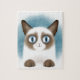 Sonriente gato siamés de ojos azules y esponjoso con fondo azul.