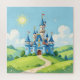 Hermoso castillo azul y blanco con banderas rojas en un día soleado de verano. Esta ilustración caprichosa y hermosa con el sol, nubes, cielo azul y hierba verde en la colina.