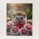 A cute hedgehog holding a red garnet heart sits in a patch of red and white carnations.