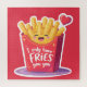 A cute and colorful cartoon illustration of a red French fries carton with a happy kawaii smiling face. The design features a floating red heart and the romantic funny pun quote "I only have FRIES for you". The image has a white sticker border, making it perfect for Valentine's Day greeting cards, fast food lovers, and humorous romantic gifts. Isolated design.