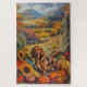 Celebra la belleza de la caída con esta vibrante pintura de un perro sentado al lado de una abundante cosecha de Acción de Gracias. Los ricos colores otoñales de las calabazas, los girasoles y el paisaje rústico de las casas de campo crean un ambiente cálido y acogedor, perfecto para cualquier amante de los perros con una decoración de temporada.