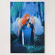 El ilustracion digital representa a una bella joven con un cabello rizado rojo. Lleva una larga capa oscura y las focas de un caballero, y sostiene una espada brillante en la mano. Con la otra, abraza un tranquilo caballo blanco con una mágica y hermosa mane. Están rodeados por un misterioso bosque nocturno
