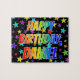 Este divertido y animado diseño de rompecabezas con temática de cumpleaños muestra el mensaje "FELIZ CUMPLEAÑOS, DANIEL" con los personajes que tienen un coloreado patrón de gradiente inspirado en el espectro de arcoiris, además de un vibrante patrón de fondo de campo estrella. Un acertado rompecabezas como este podría ser usado para enviar un mensaje de bienvenida de cumpleaños a alguien llamado Daniel. [~Z0000468]