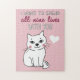 Este romántico rompecabezas tiene un gato blanco y encantador personalizado sobre un fondo rosado con un corazón blanco. Con su leyenda que dice "Quiero pasar las nueve vidas contigo", es el regalo perfecto para declarar tu amor eterno.