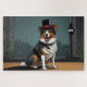 Dessin chien berger australien dans une rue le soir avec un chapeau haute forme.