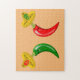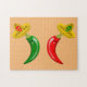 Este impresionante rompecabezas tiene un par de ajíes, un chile rojo y un chile verde. Ambos tienen ojos negros y bocas rosas. Cada chile lleva un gorra con sombrero que tiene un cráneo de color opuesto al ají en celebración del Día de los Muertos en México, Día de los Muertos. El sombrero también contiene tres flores con pétalos rojos y verdes alternados que representan la bandera de México.