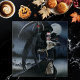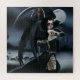 Mujer con un día de cráneo de azúcar muerto pintada en su cara. Un cuervo camina con ella en el hombro a través del cementerio. Muchos símbolos de muerte y renacimiento a su alrededor.