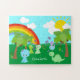 Añada un toque lúdico a su guardería o dormitorio con este adorable rompecabezas de dinosaurio. El rompecabezas tiene dinosaurios bebés viendo lindas mariposas púrpuras (y un bebé dinosaurio incluso está naciendo de su caparazón!). Los bebés están rodeados de palmeras. A lo lejos se encuentra un hermoso arco iris y un gran sol amarillo con nubes blancas. Personalice el rompecabezas con el nombre de su hijo o hija.