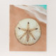 Rompecabezas en un dólar de arena detallado descansando sobre arena suave con olas suaves entrando. La textura acuática le da un ambiente tranquilo y de playa, y los tonos naturales lo mantienen sencillo pero elegante.