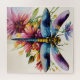 Esta obra de arte floral de la naturaleza incluye una libélula colorida en tonos violeta, azul y dorado sobre un fondo floral de flores vibrantes y de colores vivos. Un hermoso retrato de insectos multicolor.