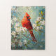Una hermosa postal con un cardenal vibrante encaramado en medio de delicadas flores blancas florecientes, que capturan la pacífica armonía de la naturaleza en un impresionante diseño artístico.