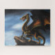 Dragón al borde de un acantilado, cielo azul, montañas.