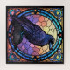 Representado en vidrios manchados, un cuervo espeluznante y espeluznante pone la mirada en el espectador.