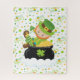 El diseño dulce y festivo, las endechas lindas de un leprechaun del dibujo animado se encaramó sobre una mina de oro negra contra un fondo de tréboles coloreados multi.