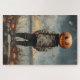 La imagen representa a una figura de pie en un entorno exterior, con un atuendo militar desgastado y resistente con botas. En lugar de una cabeza, la figura tiene una gran calabaza tallada con una cara amenazante y brillante de jack-o'-linterna. El cielo está nublado, lo que da al lugar un ambiente espeluznante, y el suelo está repartido por una vegetación seca y dos pequeñas calabazas, que hacen hincapié en el tema de Halloween. El estilo de la pintura recuerda a la clásica Americana, evocando tanto la nostalgia como la inquietud.