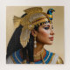"El realismo de Cleopatra VII: un retrato". Una representación de Cleopatra VII parecida a la vida la muestra con una nariz prominente, ojos en forma de almendra y una barbilla fuerte. Su cabello, trenzado y adornado con oro de plumas, complementa a su diadema de oro en forma de buitre, que simboliza la pureza y la maternidad, y también el ciclo eterno de la muerte y el renacimiento. Los pendientes de la Perla y un collar intrincado realzan la presencia dominante de la reina con una mirada inteligente que refleja su carisma e ingenio legendarios.