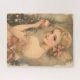 Vintage Navidad Elegante Chica con vestido rosa decorando un árbol de Navidad con rompecabezas rosado en balbuceo.