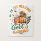 Diseño pacífico y colorido con una escena otoño/otoño con calabaza, taza de café, mariposas y flores caídas. El colorido texto inspirador dice: "En la espera Dios está trabajando". Este diseño está disponible en una amplia variedad de productos.
