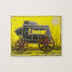 Un Estrella de Madera Oscura se sienta bajo un abrasador paisaje solar desértico en un camino de tierra desolada entre cactus mientras las aves vuelan sobre sus cabezas. Imagen del viejo entrenador negro del oeste sobre fondo amarillo con un borde de alambre de púas alrededor del borde exterior de la imagen que agrega una persona áspera y un filo borde de lo que era uno de los modos de transporte del Viejo Oeste.