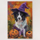 Admire el espíritu de Halloween con este diseño encantador que presenta un perro lindo en un gorra de brujas rodeado de calabazas talladas. Perfecto para añadir un toque de encanto espeluznante a sus celebraciones festivas.