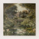 pintura vintage de una escena botánica de cisnes nadando en el agua en un jardín inglés con nenúfares, puentes y muchas flores exóticas