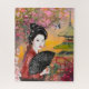 Este rompecabezas presenta a un bello japonés con la escena de una casa japonesa, una mujer japonesa con ropa tradicional y flores de Sakura.