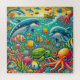 Una vibrante escena submarina muestra diversa vida marina, destacando delfines, peces coloridos, coral y un pulpo. La atmósfera alegre lleva la belleza y vivacidad del mundo acuático al primer plano.