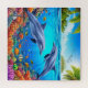 Dos delfines nadan con gracia en aguas tropicales vibrantes rodeados de coloridos arrecifes de coral y peces, con un exuberante paisaje insular visible en el fondo, creando un ambiente marino sereno y animado.