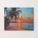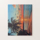Una serena puesta de sol tropical con palmeras de silueta frente a un vibrante cielo reflejado en las aguas estancadas.