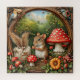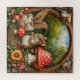 Un cuadro detallado que representa una acogedora escena boscosa con un ratón, taburetes, una bolsa de granos y pájaros que rodean un marco circular decorativo, todo ello decorado en vivos tonos naturales.