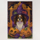 Admire el espíritu de Halloween con este diseño encantador que presenta un perro lindo en un gorra de brujas rodeado de calabazas talladas. Perfecto para añadir un toque de encanto espeluznante a sus celebraciones festivas.